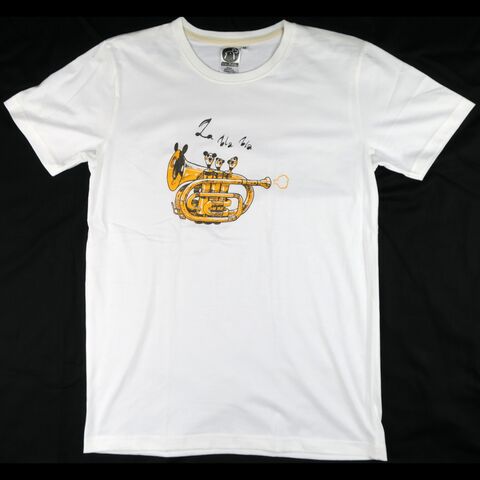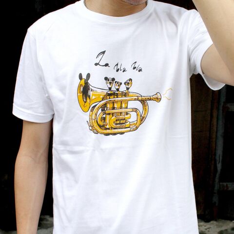 パンダがトランペットに?「トランペットパンダ」Tシャツ。 トランペットの指で押さえる部分(ピストンバルブ)の先端が三引きのパンダになって、楽しそうに歌ってます。 音が出るベルの部分にもパンダの顔がついており、本来は息を吹き込むマウスピースの部分からは、歌に合わせてか息が吹き出して、「La La...